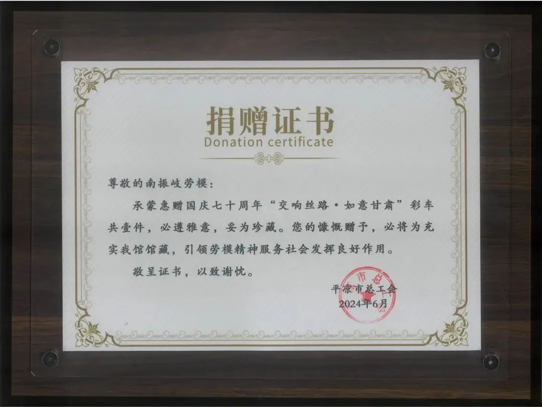 仪式前,大家共同观看了南特集团三十周年发展介绍短片。唐彩峡同志介绍了平凉市劳模精神展示馆相关情况。赵锋同志代表德彩网向南特集团颁发收藏证书和捐赠证书,并与南振岐董事长共同为捐赠彩车揭牌。
