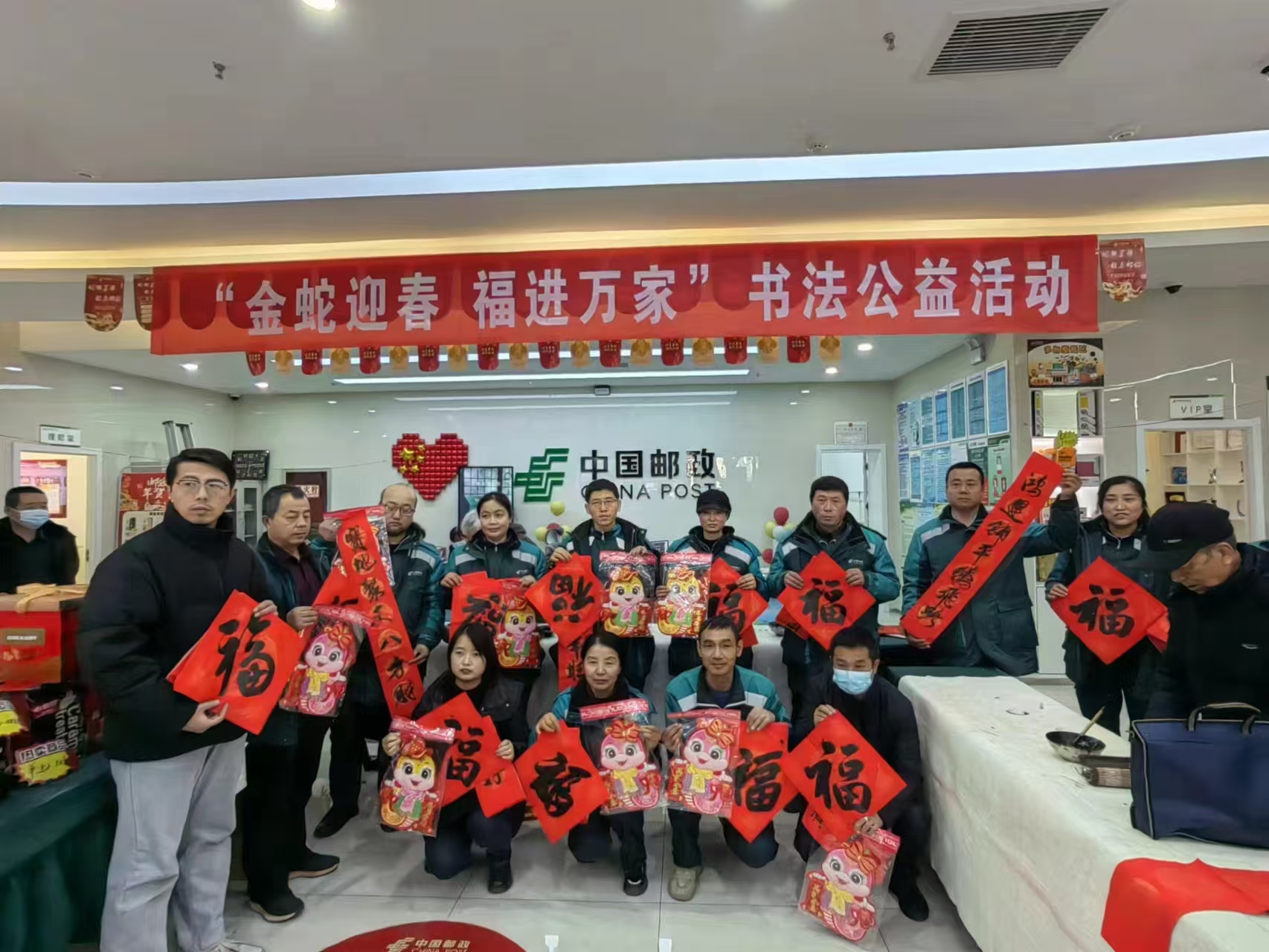 1月20日,市总工会组织我市知名书法家和书法爱好者志愿服务团队走进中国邮政崆峒区分公司西大街营业所,开展“金蛇迎春·福进万家”书法公益活动,为常年奔波在外的快递小哥送上春联和“福”字,让他们感受到浓浓的年味和来自工会“娘家人”的新春祝福。