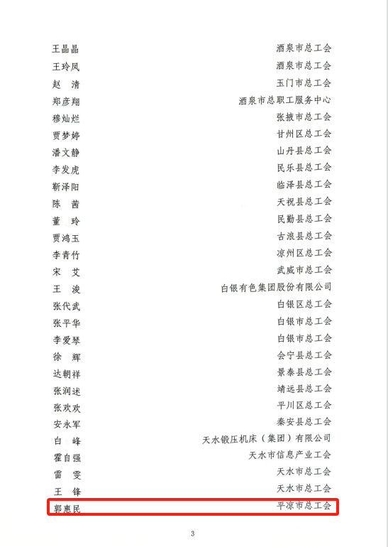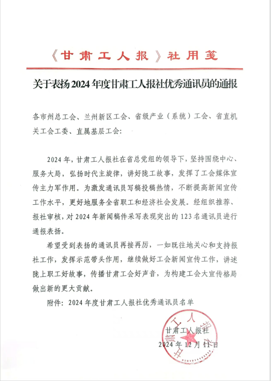近日,《甘肃工人报》社发布《关于表扬2024年度甘肃工人报社优秀通讯员的通报》,对2024年新闻稿件采写表现突出的123名通讯员进行通报表扬,平凉市郭惠民、高伟、刘馨、胥岩、张小燕等5名职工获得表扬。