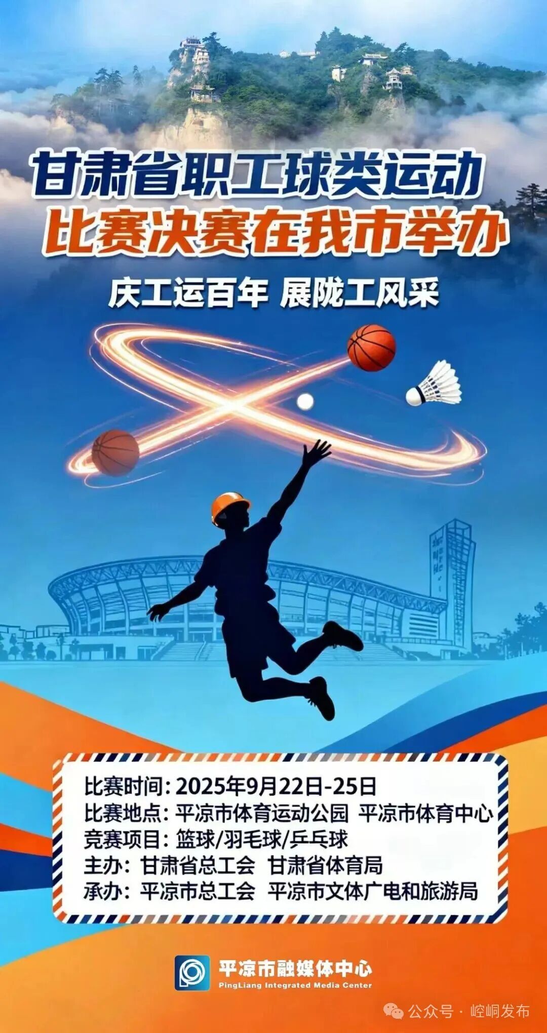 9月22日至25日,甘肃省职工球类运动比赛决赛将在平凉市体育运动公园和体育中心举行。本次赛事涵盖篮球、羽毛球、乒乓球三大类共十余个项目,共有来自全省各地、各行业的48支职工代表队参与角逐。