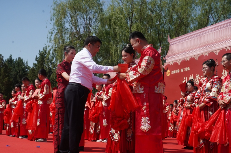 80对新人在鼓乐笙歌海誓山盟中喜结连理。14对劳模夫妇、12对金婚夫妇身着盛装,他们一同走过广成大酒店山楂树下的绿草坪,走上红地毯,以实际行动践行文明新风、摒弃陈规陋习,共同开启人生的全新篇章。